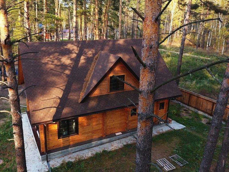 Натуральные коричневые оттенки черепицы хорошо сочетаются с фасадами в сливочных и светло-зеленых тонах. Лепестки лаконичной формы не отвлекают внимание от деталей кровли. Благородный матовый блеск гранулята подчеркивает класс материала.