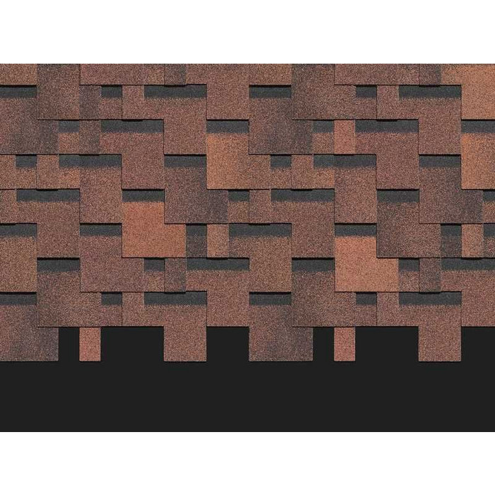 Черепица выполнена в приглушенных кофейных оттенках. Нестандартная форма лепестков гонтов эффектно подчеркнута реалистичным эффектом тени. Кровля гармонично смотрится с фасадами в светлых оттенках, под натуральный брус, камень и клинкерный кирпич.