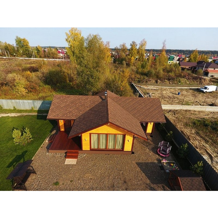Нестандартную форму гонтов эффектно подчеркивают переходы ореховых оттенков и матовый блеск гранулята. Затемненные участки лепестков создают реалистичный эффект тени. Черепица хорошо смотрится с сайдингом нейтральных светлых оттенков и фасадными панелями под камень и кирпичную кладку.
