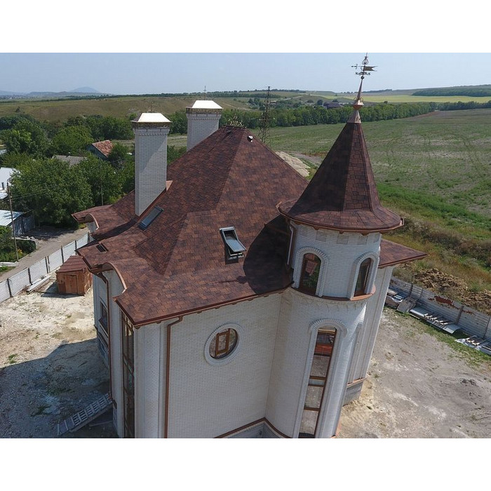 Эффектный градиент цвета и форма лепестков гонтов придают дизайну выразительность. Черепица одинаково хорошо подойдет для оформления простых крыш и кровель сложной конфигурации. Она сочетается с любыми фасадами, выполненными в теплых тонах.
