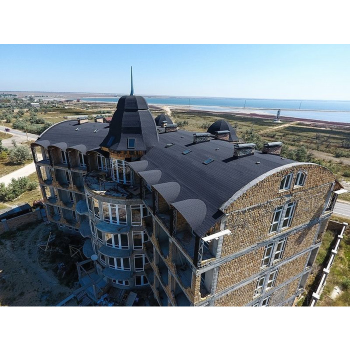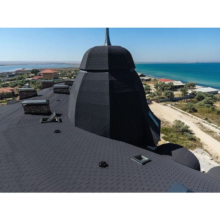 Гонты глубокого серого цвета с лепестками традиционной формы отлично подходят для оформления крыш сложной конфигурации. Черепица подчеркивает красоту деталей, при этом делает кровлю визуально более компактной. Она идеально сочетается с нейтральными светлыми оттенками и фасадами более насыщенных тонов.