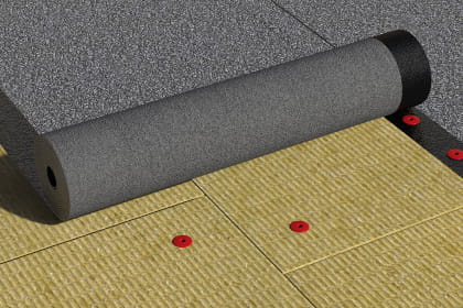 Рулонный битумно-полимерный СБС-модифицированный материал на нетканой основе из высокопрочного полиэстера с крупнозернистой посыпкой на верхней стороне полотна и мелкозернистой посыпкой на нижней.