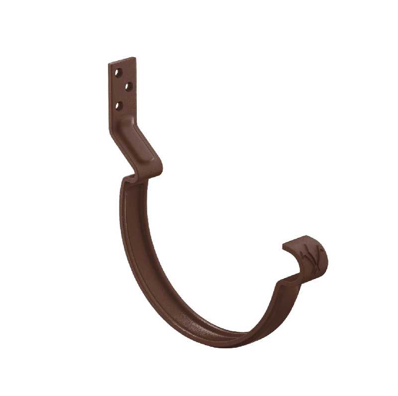 Конструкция крюка имеет более вытянутое и глубокое ребро жесткости, поэтому крюк выдерживает повышенные силовые нагрузки. Передний замок крюка фиксирует завиток желоба снаружи, и благодаря этому желоб удобно монтировать даже после установки фартука-капельника. Задний замок имеет конструкцию, исключающую смещение желоба под нагрузкой. Отверстия под крепеж выполнены с зенковкой под шляпку в потай. На передней части крюка расположен фирменный штамп - лилия.Поставляется с комплектом креплений.