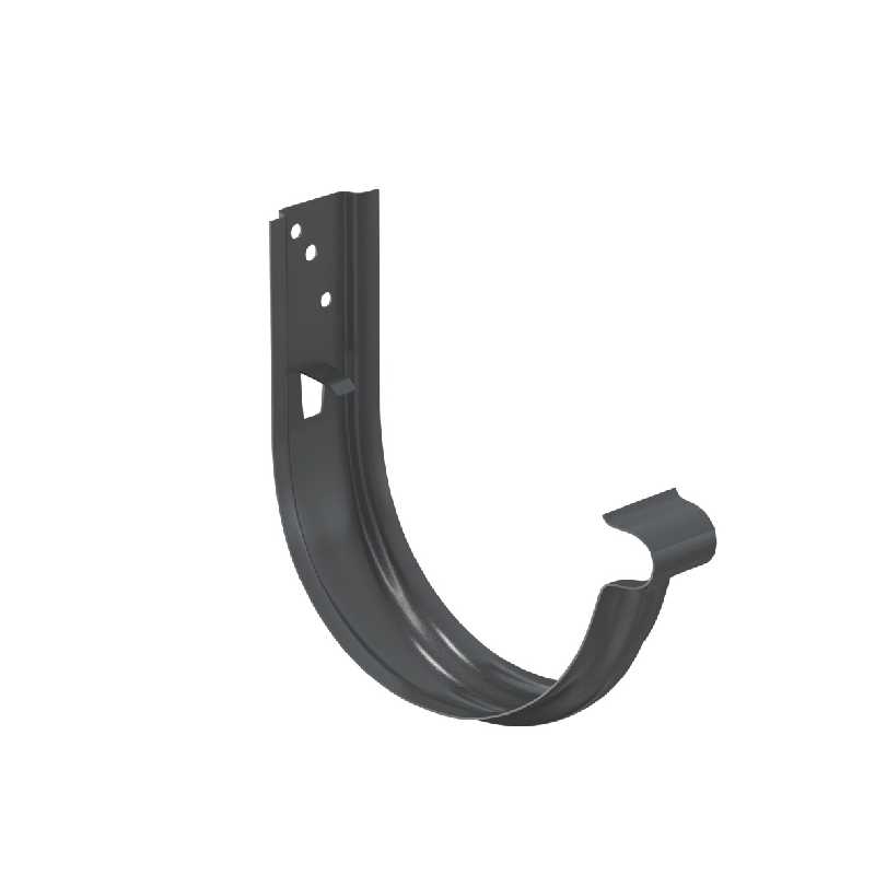 Крюк крепления желоба универсальный предназначен для крепления водосточного желоба по аналогии со стандартными крюками крепления желоба, и может быть использован как в качестве короткого крюка, так и в качестве длинного (при условии применения удлинителя крюка). Наличие изгиба для завитка желоба в передней части позволяет устанавливать желоба в крюки без отгиба установленного ранее фартука («капельника»). Наличие дополнительных ребер жесткости делает крюк очень прочным.
