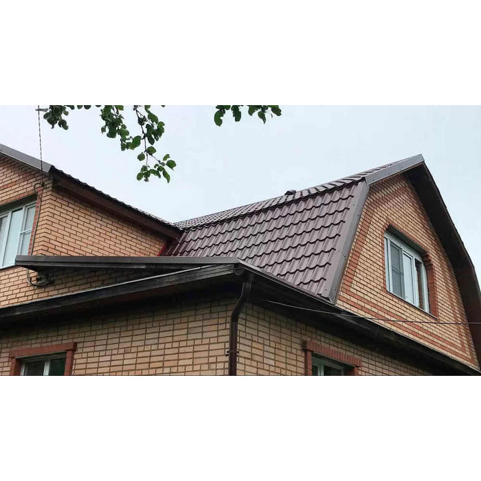 • Кровля защищена от механических воздействий, так как в основе металлочерепицы сталь толщиной 0.45 мм (с учётом металла, цинкового и полимерного слоя).