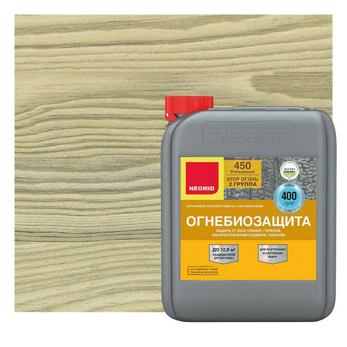 NEOMID 450 защищает древесину на срок до 7 лет от возгорания и распространения пламени, обеспечивая II группу огнезащитной эффективности согласно ГОСТ Р 53292 (переводя древесину в трудновоспламеняемый материал), и на срок 8-10 лет от гниения, возникновения плесени, при отсутствии контакта с влагой.