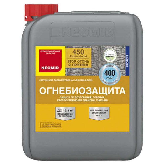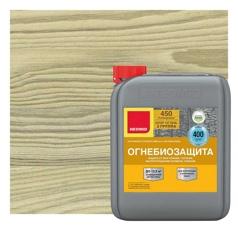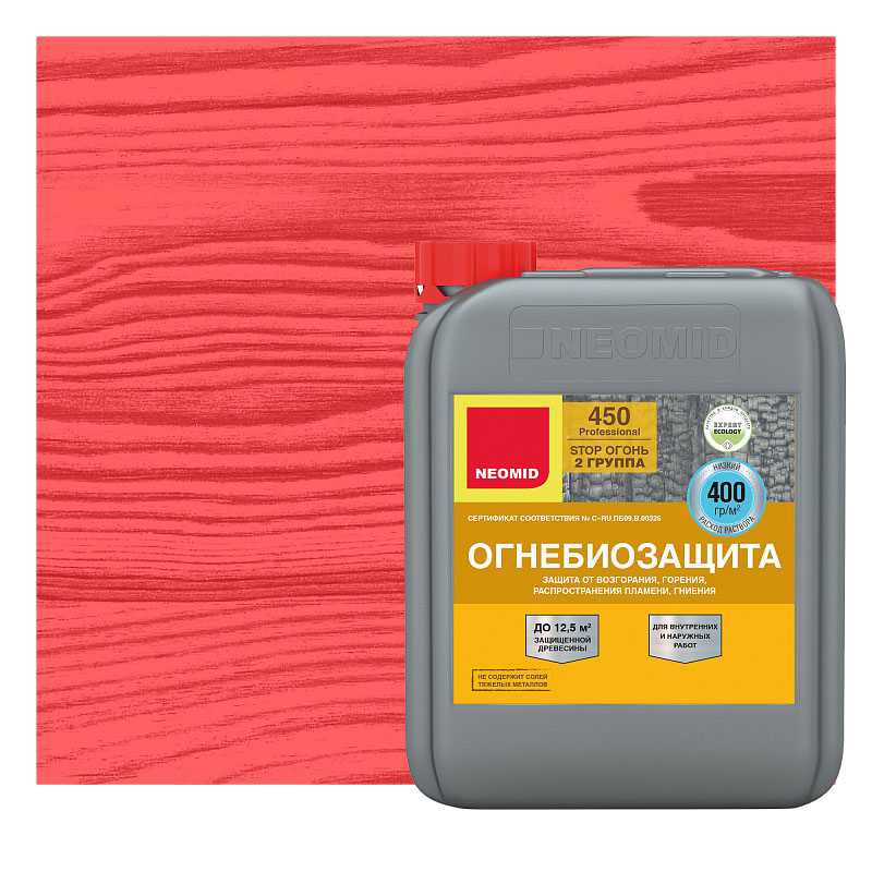 NEOMID 450 защищает древесину на срок до 7 лет от возгорания и распространения пламени, обеспечивая II группу огнезащитной эффективности согласно ГОСТ Р 53292 (переводя древесину в трудновоспламеняемый материал), и на срок 8-10 лет от гниения, возникновения плесени, при отсутствии контакта с влагой.