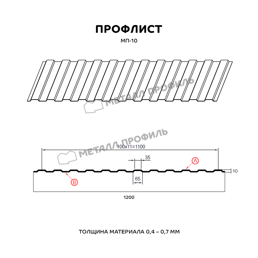 МП-10 – один из классических типов стенового профлиста. Он замечательно смотрится в виде вентилируемого фасада, стенового материала, подвесного потолка в нежилых зданиях, декоративного ограждения, забора. МП-10 характеризуется трапециевидной формой волны, аналогичной с двух сторон. Глубина трапеции – 10 мм, что не придаёт материалу высокой способности выдерживать большие нагрузки, но при оформлении стен это не самое главное. Зато минимальный рельеф профилированного листа не придаёт зданию суровый вид. На технические свойства можно воздействовать, выбрав ту или иную толщину металла. МП-10 изготавливается в вариантах от 0,4 до 0,7 мм. Увеличить защиту от ржавчины позволит финишный полимерный слой. Он не только обладает богатым цветом, устойчивым к выгоранию под УФ-лучами, но и предупредит мелкие механические дефекты и ржавение стали.