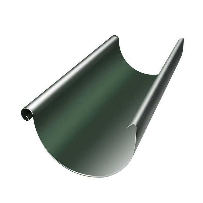 Желоб полукруглый предназначен для сбора дождевой воды с кровли. Желоб фиксируется на крюках, установленных с промежутком 600-900мм и обеспечивающих уклон 5 , мм на погонный метр.